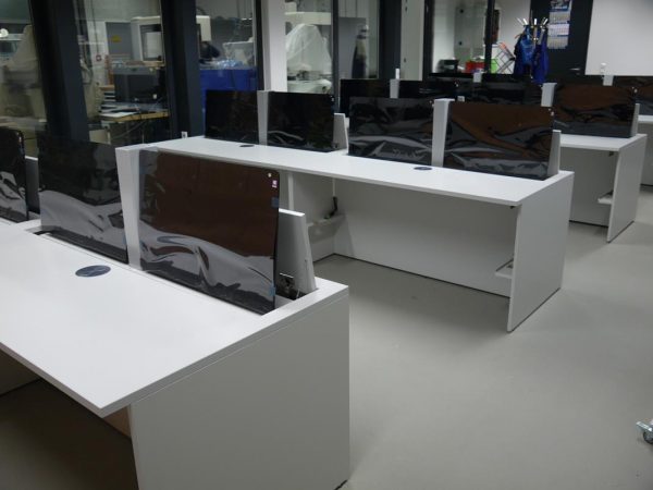 Schulungs- und Konferenzraum: Schulungsmöbel mit versenkbaren TFT-Monitoren und LED-Beleuchtung sowie flächenbündiger und verschließbarer Steckdosen-Einheit in Edelstahl. Ebenso wurde eine interaktive Tafel eingebaut. Sehen Sie hier weitere Videos: Referenz Kassel, BZ (27″ Monitore) und Referenz Frankfurt/Main – Uni