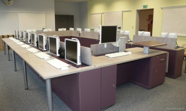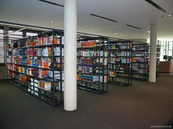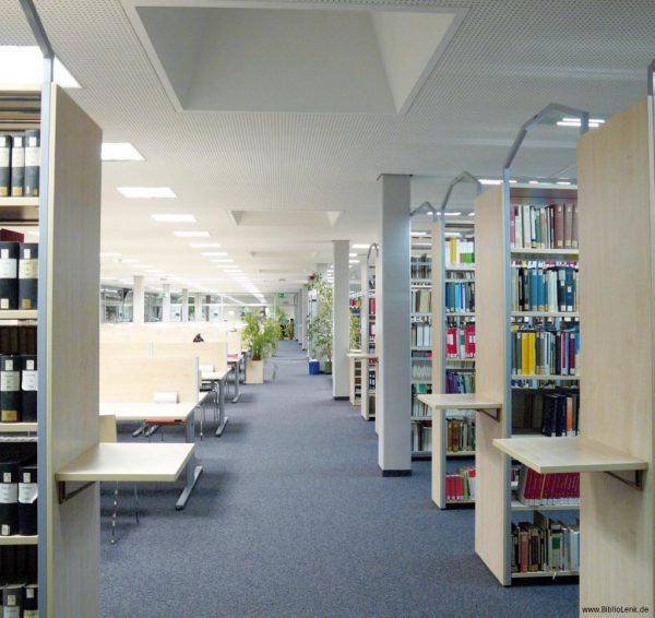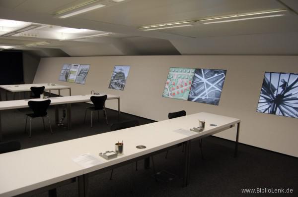 Im Schulungsraum kommt ein kundenspezifisch entwickelter Dozententisch mit versenkbarem Monitor zum Einsatz. Weiterhin sind Garderobenschränke mit Acrylglas-Türen eingesetzt und Benutzerfahrschränke mit Glastüren. Eine Sonderentwicklung war der zweiseitige Selbstverbucherplatz für 3M-Technik.